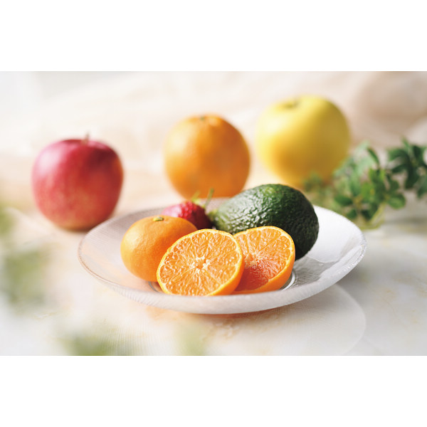 ●サンふじ(青森県産)×1、王林またはシナノゴールド(青森県産)×1、みかん(静岡県産)×2、いちご(静岡県産)×2、アボカド(メキシコ産)またはキウイ(ニュージーランド産)×1、オレンジ(アメリカ産)×1 ※フルーツの種類・品種・産地は変更となる場合があります。